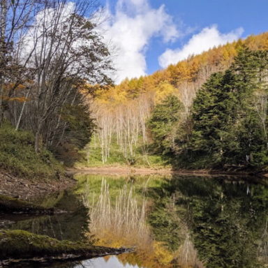 御池山隕石クレーターは日本で初めての隕石クレーターと言われています。そのクレータの沿線上を散策できる御池山ハイキング。途中の中郷の池に映る自然がとても美しいです。