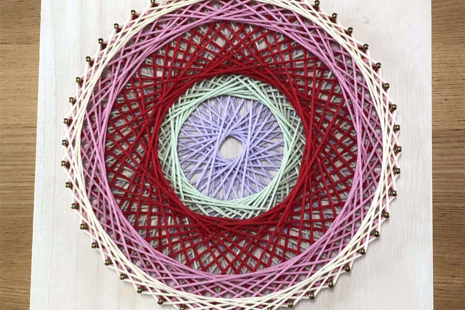素数の数の釘を木の板に打ちそこに糸を規則的に掛けていくとカラフルで綺麗な模様が浮き上がってくる技法です。